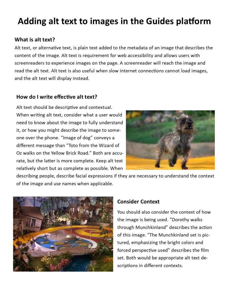 For this project, I was tasked to create a quick and easy-to-understand document for users to add to alt text to their images in Springshare’s LibGuides platform, as well as how to write effective alt text.