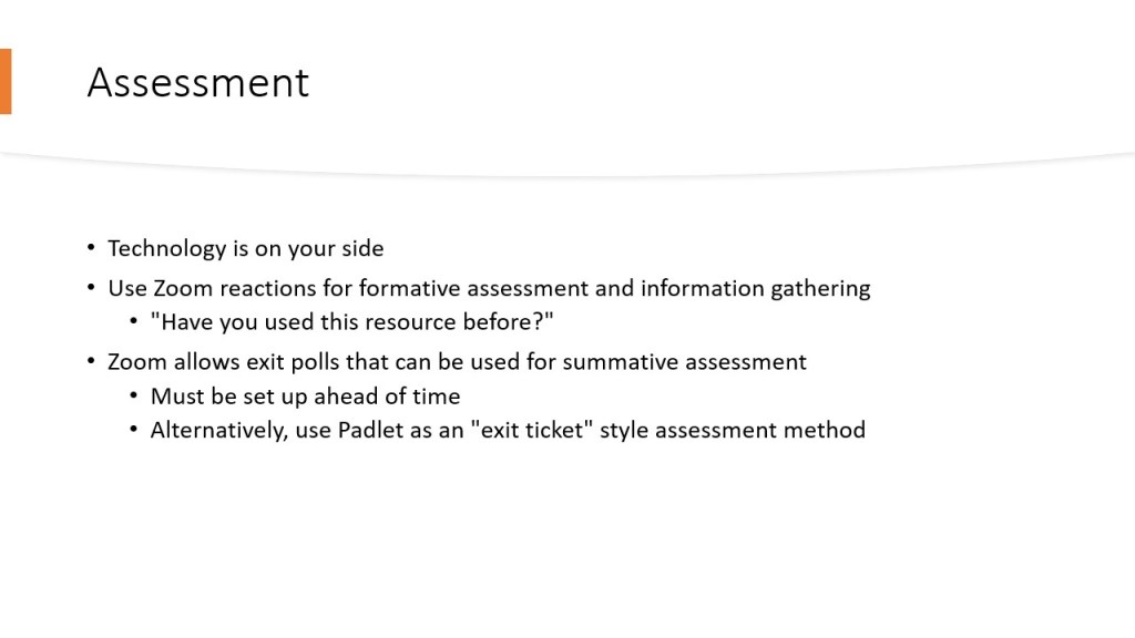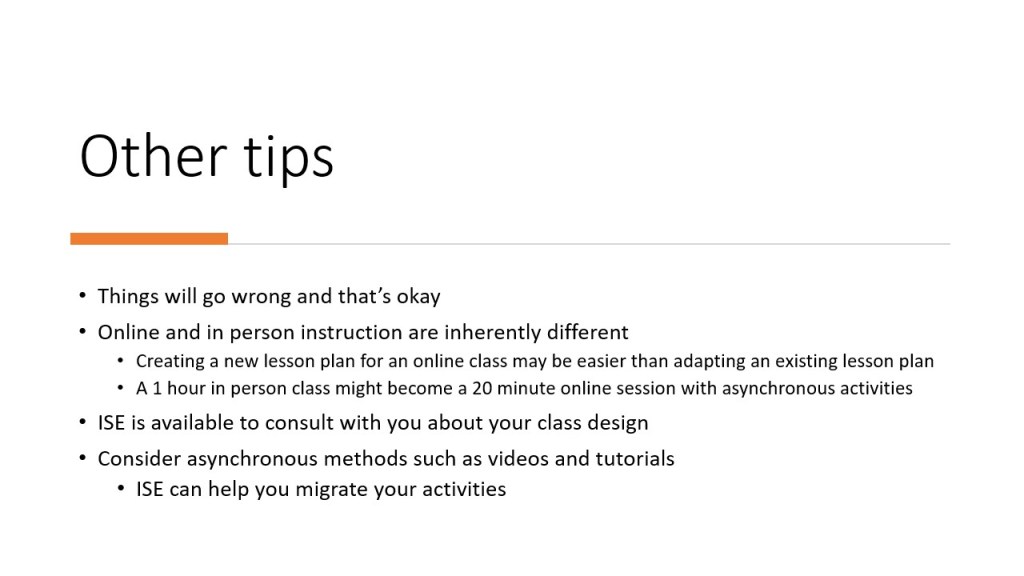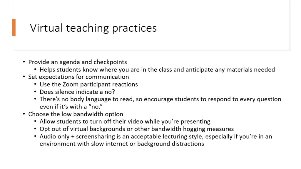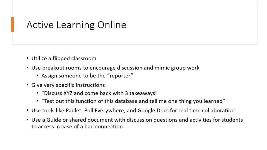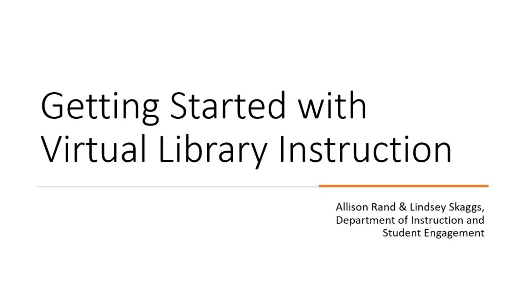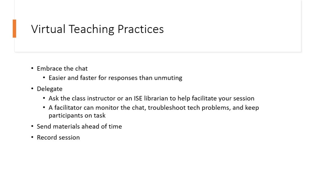 The slides below are from a training I provided in August 2020 to introduce librarians to teaching in a virtual environment. Outcomes for this session were:
